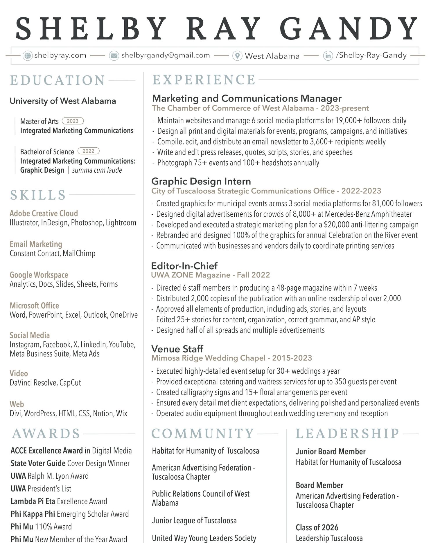 RESUME PROFILe Integrated marketing communicator with a strong foundation in graphic design, strategic content creation, and digital storytelling. Passionate about elevating brands and communities through compelling visuals and clear messaging. Download shelby ray gandy web photo video design write letter about Contact